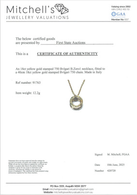 Bvlgari B.Zero1 necklace. 18ct yellow gold with 40cm Bvlgari 18ct yellow gold chain. Weight: 12.2g. With Certificate #420720. (Pre-owned)