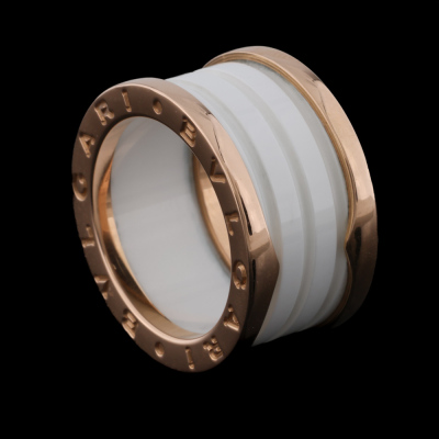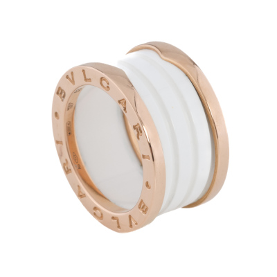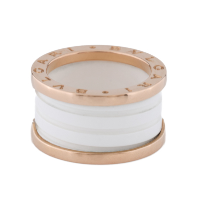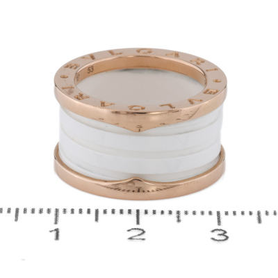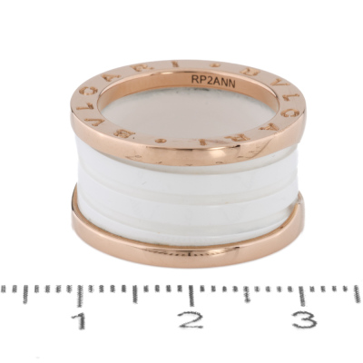 Bvlgari B.Zero1 four-band ring. 18ct rose gold with white ceramic spiral. Bvlgari stamped size 53, measures as Australian size: L - ring resizing is not recommended. Width: 12.1mm. Made in Italy. Weight: 10.1g. With Bvlgari Card dated 20/09/2020.