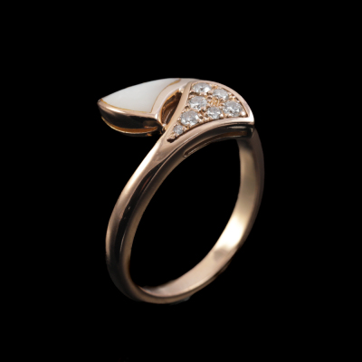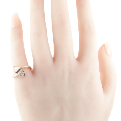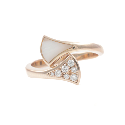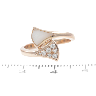 Bvlgari Divas' Dream ring with Mother of Pearl and 7 round Natural Diamonds totalling 0.10ct. 18ct rose gold. Ring size J - ring resizing is not recommended. Band width: 2.1mm. Made in Italy. Weight: 3.3g. (Pre-owned)