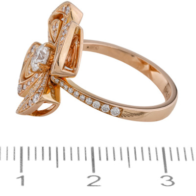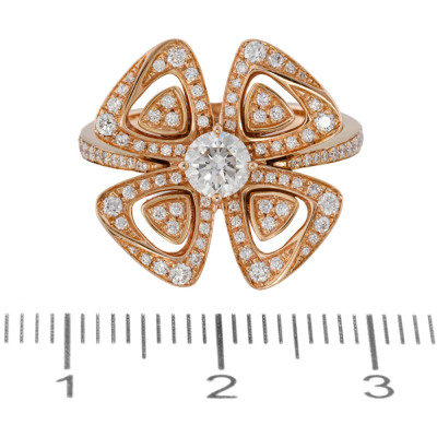 Bvlgari Fiorever Diamond ring with centre round Natural Diamond of approximately 0.30ct (Estimate grading: F-G VS) and remaining round Natural Diamonds totalling approximately 0.36ct (Estimated grading: F-G VS). 18ct rose gold. Bvlgari stamped size 53. Band width: 2.4mm - 1.9mm. Weight: 6.1g. Engraved with 'NHLCLL' Made in Italy. With Bvlgari Card dated 22/03/2019 and Bvlgari box.