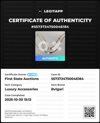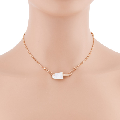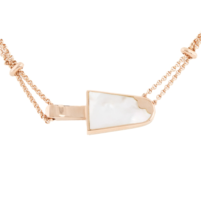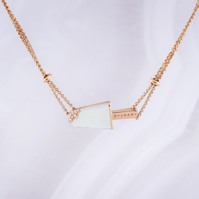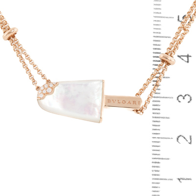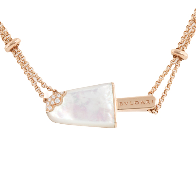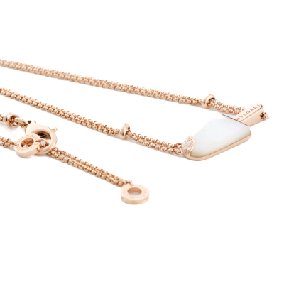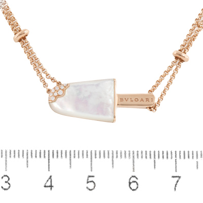 Bvlgari Gelati necklace with Mother of Pearl and round Natural Diamonds totalling approximately 0.05ct. Motif size: 26.0mm x 10.5mm. 18ct rose gold with Bvlgari 18ct rose gold double chain. Length: 37.5cm - 41cm - 44.5cm. Made in Italy. Weight: 10.7g. With Bvlgari box. With Certificate #5573734750046184. (Pre-owned)