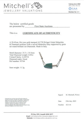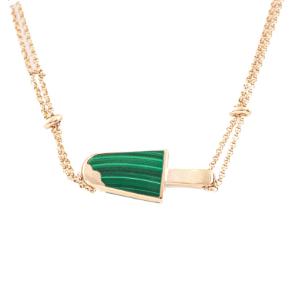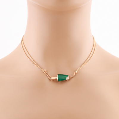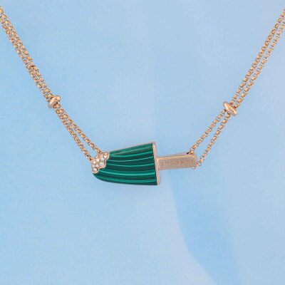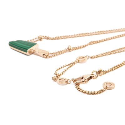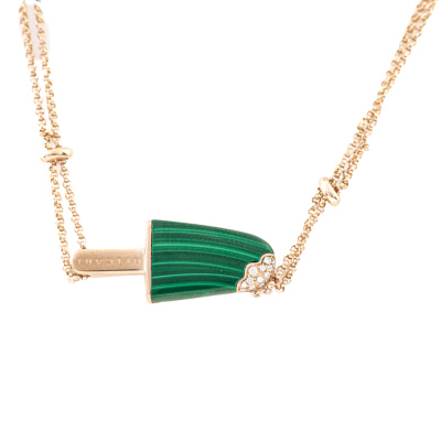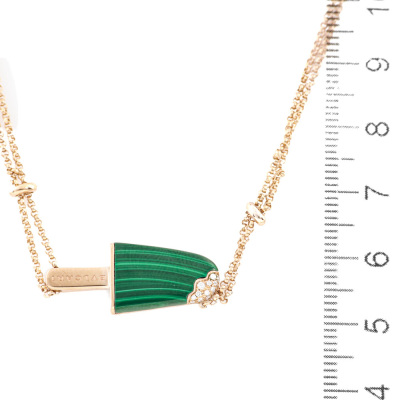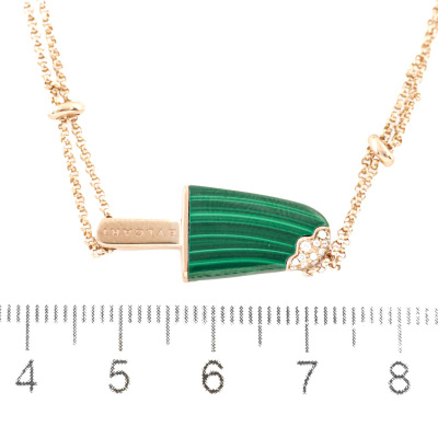 Bvlgari Gelati necklace with Malachite inlay and round Natural Diamonds totalling approximately 0.05ct. Motif size: 26.0mm x 10.5mm. 18ct rose gold with Bvlgari 18ct rose gold double chain. Length: 39cm - 42cm - 45cm. Made in Italy. Weight: 11.3g. (Pre-owned)