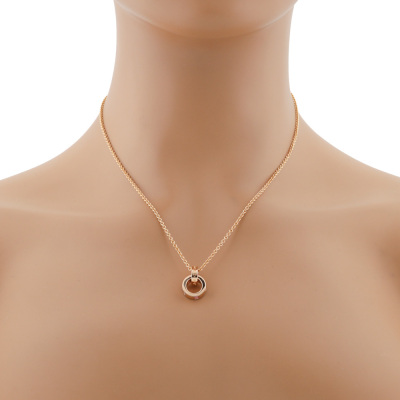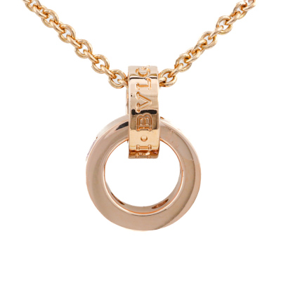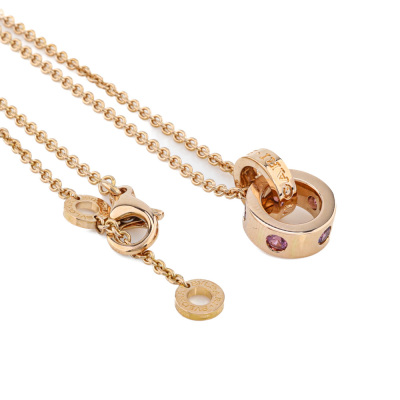 Bvlgari Roman Sorbets pendant with 3 round Natural pink Tourmaline totalling approximately 0.36cts & 2 round Natural Amethyst totalling approximately 0.20cts. Motif of interlocking loops, approximately 1.6 x 1.1 cm in size. 18ct rose gold with Bvlgari 42cm - 45cm 18ct rose gold adjustable chain. Made in Italy. Weight: 12.4g. (Pre-owned)