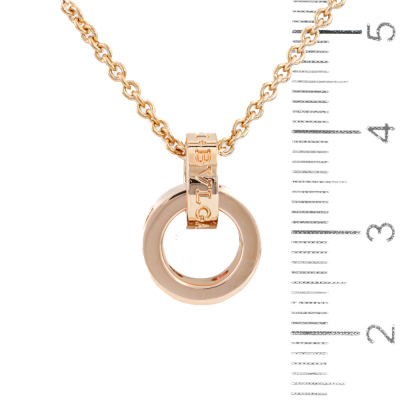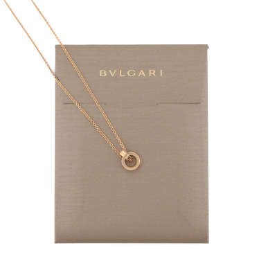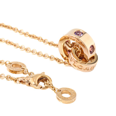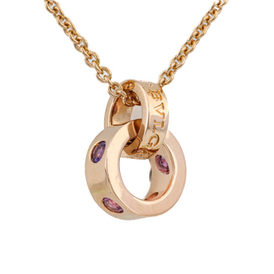 Bvlgari Roman Sorbets pendant with 3 round Natural pink Tourmaline totalling approximately 0.36ct & 2 round Natural Amethyst totalling approximately 0.20ct. Motif of interlocking loops, approximately 1.6 x 1.1cm in size. 18ct rose gold with 18ct rose gold adjustable Bvlgari chain. Length 40cm-43cm. Made in Italy. Weight: 12.0g. With Bvlgari Certificate of Authenticity dated 15/05/2017.