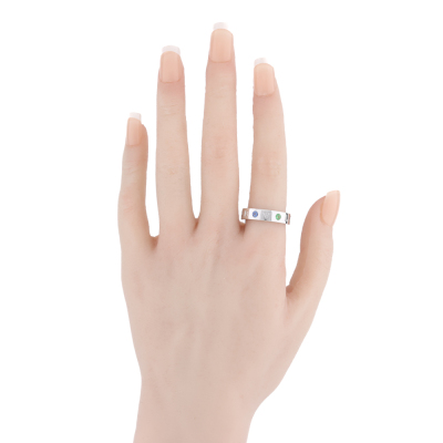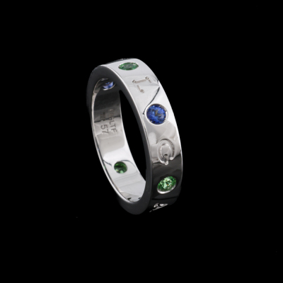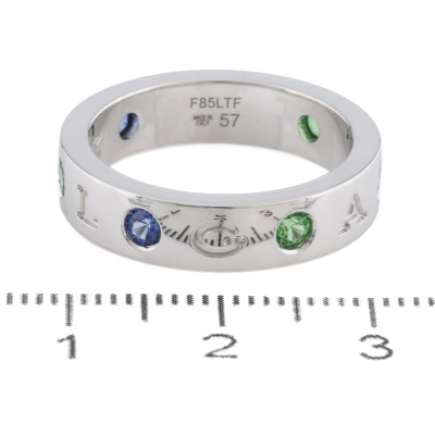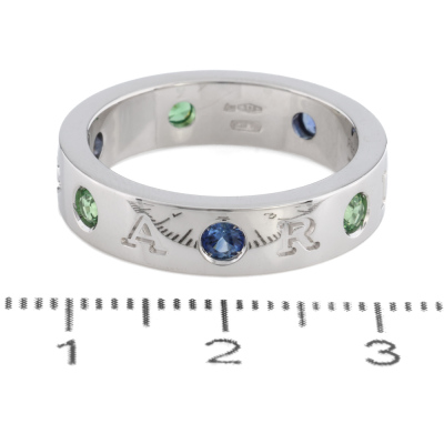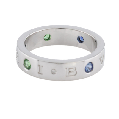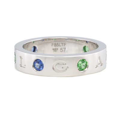 Bvlgari Bvlgari Roman Sorbets ring with 3 round Natural Blue Sapphires & 3 round Natural Tsavorites, each diameter of 2.9mm and with a round Natural Diamonds of approximately 0.01ct. 18ct white gold. Bvlgari stamped size 57, measures as Australian size: P. Band width: 5.1mm. Weight: 9.5g. (Pre-owned)