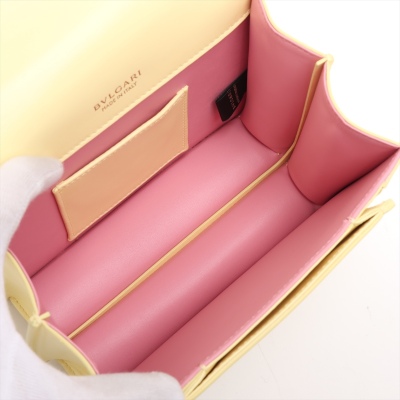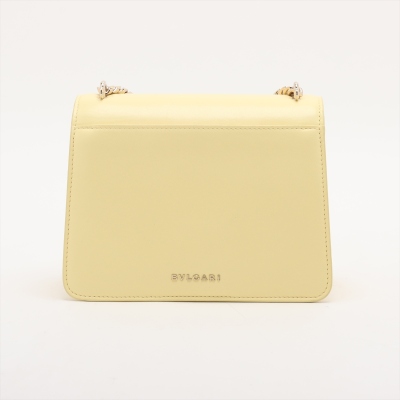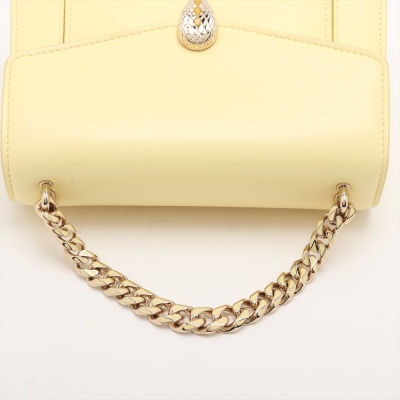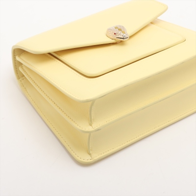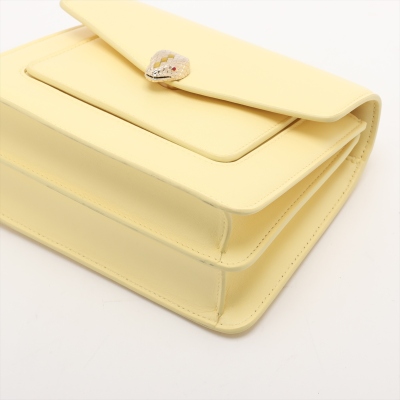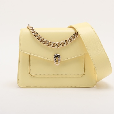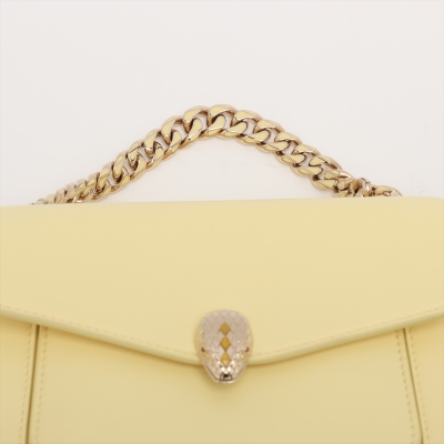 Bvlgari Serpenti Forever bag in yellow Nappa leather. Featuring gold-toned hardware, a flat pocket at back, maxi chain handle, and frontal flap with Serpenti head detail. The magnetic snap button closure opens to a front patch pocket and a pink leather lining interior. Approximate dimensions: 19.5cm(base-W) x 15cm(H) x 9cm(D), with a 7cm chain drop and 45cm adjustable strap drop. Accompanied by a Bvlgari mirror, raincoat and dustbag. With LegitApp Authentication Certificate.