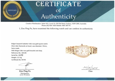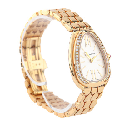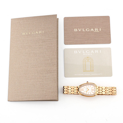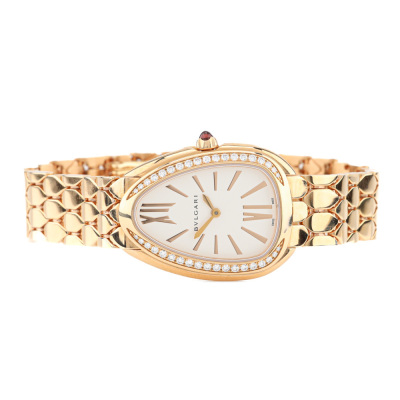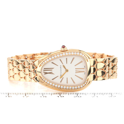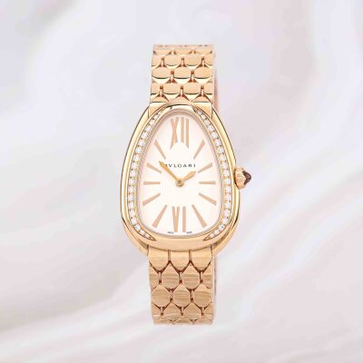 Bvlgari Serpenti Seduttori 18ct rose gold quartz ladies watch. Silver dial, Diamonds on bezel, case diameter: 33mm, writ size: 17.5cm, Swiss made. Ref# 103146. With Bvlgari 18ct rose gold bracelet and clasp. With Certificate of Authenticity, Bvlgari International Warranty card dated 08/01/2023 and Bvlgari box. Balance of 5 year Bvlgari manufacturer warranty applies. (Pre-owned)