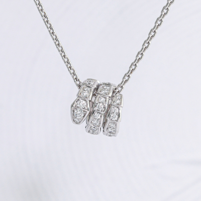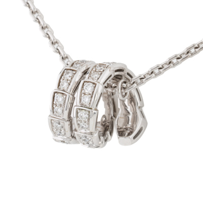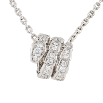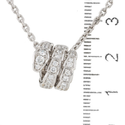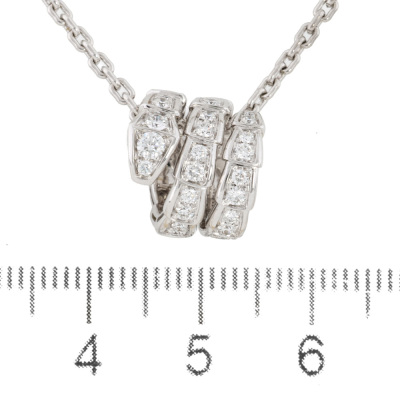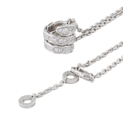 Bvlgari Serpenti Viper Diamond necklace with round Natural Diamonds totalling 0.63ct (Estimated grading: F VS). 18ct white gold with 41cm - 43cm Bvlgari 18ct white gold adjustable chain. Weight: 12.9g. With Bvlgari box. With Certificate #1617602667610487.