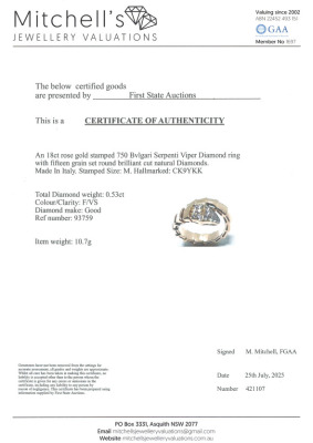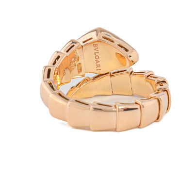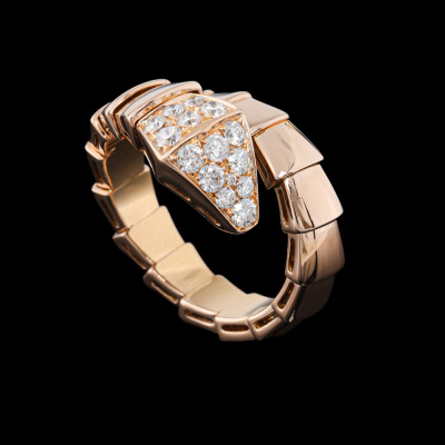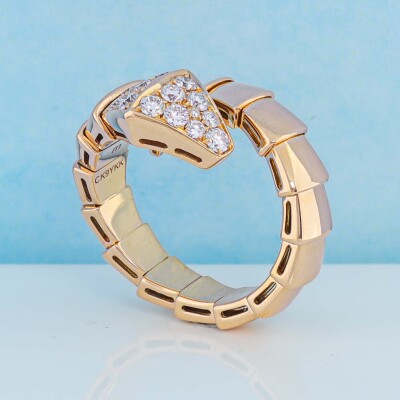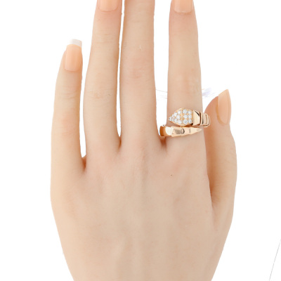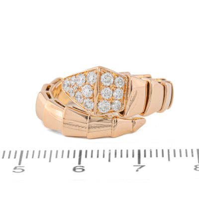 Bvlgari Serpenti Viper ring with 15 round Natural Diamonds totalling 0.53ct (Estimated grading: F VS). 18ct rose gold. Bvlgari stamped size: M, measures as smallest Australian size: M - ring resizing is not recommended. Note - the wrap around design allows for a slightly bigger fit. Made in Italy. Weight: 10.7g. With Certificate #421107. (Pre-owned)