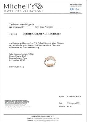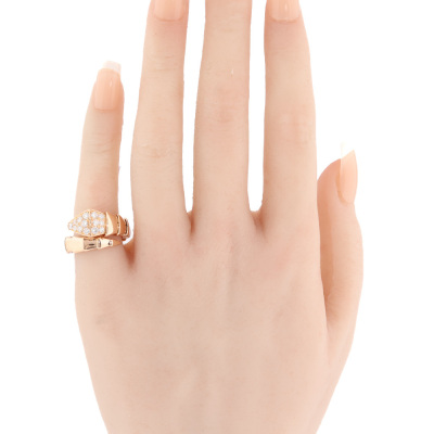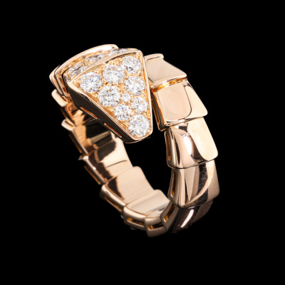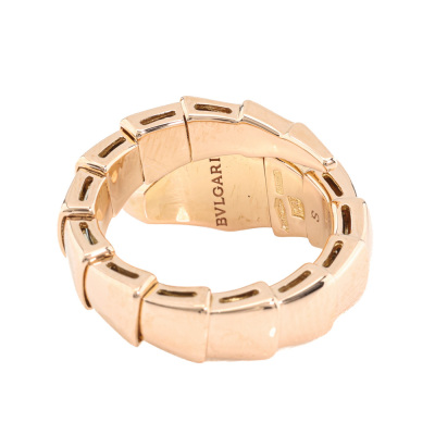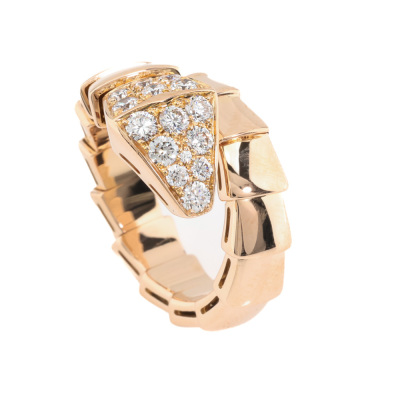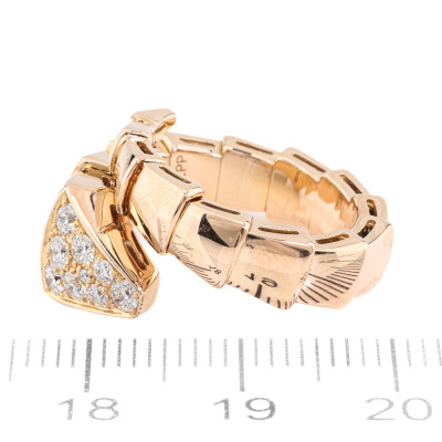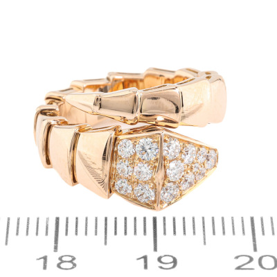 Bvlgari Serpenti Viper ring with 15 round Natural Diamonds totalling 0.53ct (Estimated grading: F VS). 18ct rose gold. Bvlgari stamped size: S, measures as smallest Australian size: I 1/2- ring resizing is not recommended. Note - the wrap around design allows for a slightly bigger fit. Made in Italy. Weight: 9.4g. With Certificate #421363. (Pre-owned)