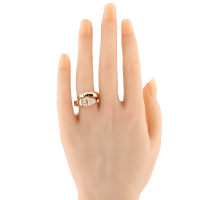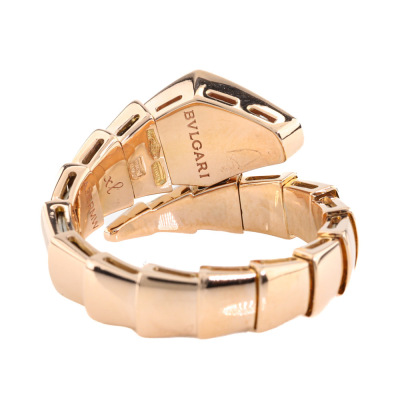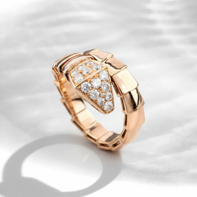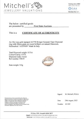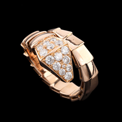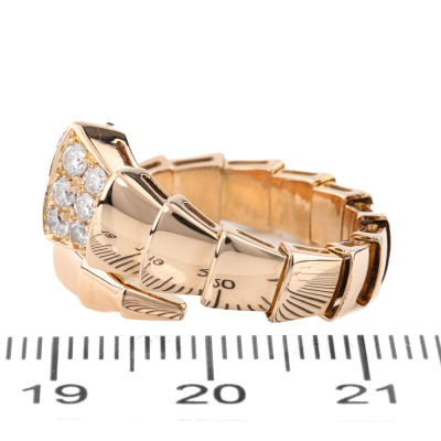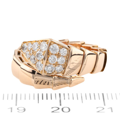 Bvlgari Serpenti Viper ring with 15 round Natural Diamonds totalling 0.53ct (Estimated grading: F VS). 18ct rose gold. Bvlgari stamped size: xl (X-Large), measures as smallest Australian size: M 1/2 - ring resizing is not recommended. Note - the wrap around design allows for a slightly bigger fit. Made in Italy. Weight: 9.0g. With Certificate #421369. (Pre-owned)