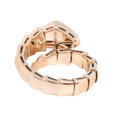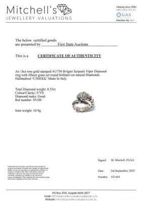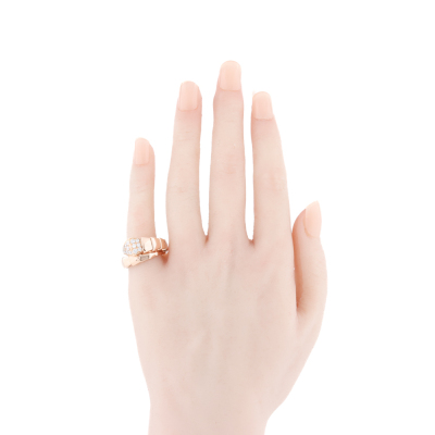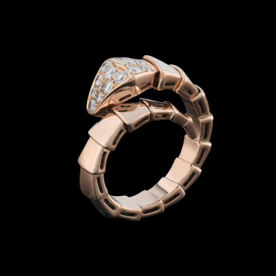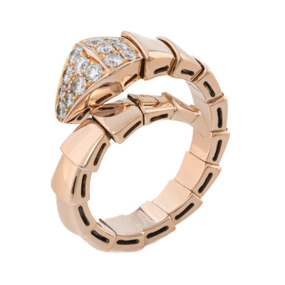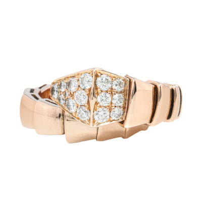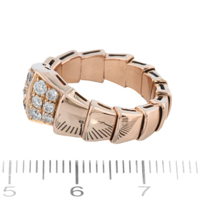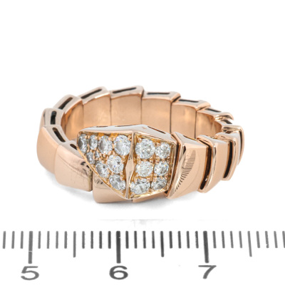 Bvlgari Serpenti Viper ring with 15 round Natural Diamonds totalling 0.53ct (Estimated grading: F VS). 18ct rose gold. Bvlgari stamped size: M (Medium), measures as smallest Australian size: J - ring resizing is not recommended. Note - the wrap around design allows for a slightly bigger fit. Made in Italy. Weight: 10.9g. With Certificate #421444. (Pre-owned)