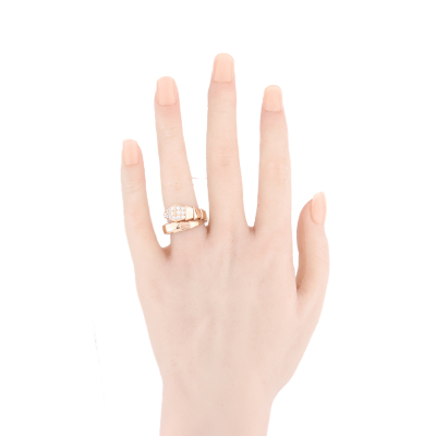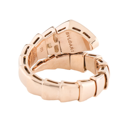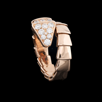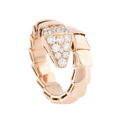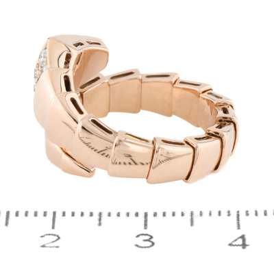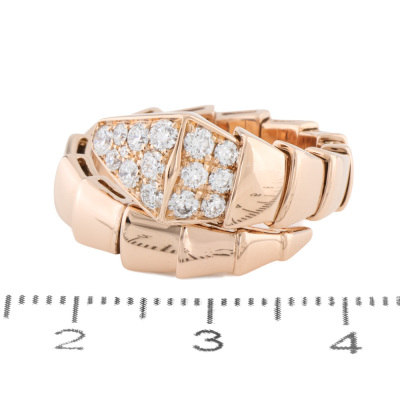 Bvlgari Serpenti Viper ring with 15 round Natural Diamonds totalling 0.53ct (Estimated grading: F VS). 18ct rose gold. Bvlgari stamped size: M (Medium), measures as smallest Australian size: N - ring resizing is not recommended. Note - the wrap around design allows for a slightly bigger fit. Made in Italy. Weight: 9.2g. With Bvlgari box. With Certificate #0461906786381369. (Pre-owned)