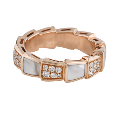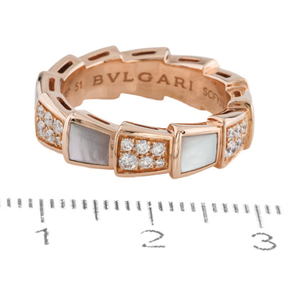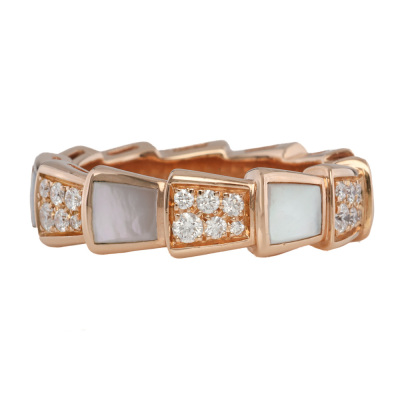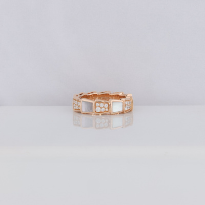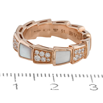 Bvlgari Serpenti Viper ring with round Natural Diamonds totalling 0.34cts (Estimated grading: F-G VS) and Mother of Pearl inlay. 18ct rose gold. Bvlgari stamped size 51, K - ring resizing is not recommended. Band width: 5.4mm. Made in Italy. Weight: 6.3g. With Bvlgari box & Card dated 24/04/2021 (Pre-owned)