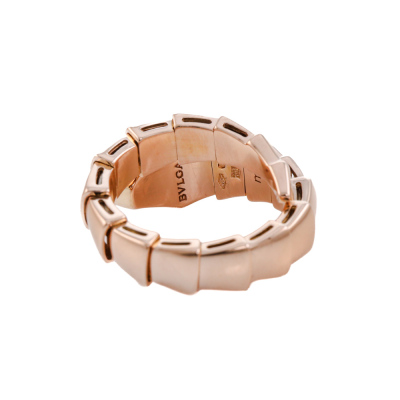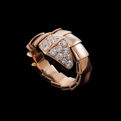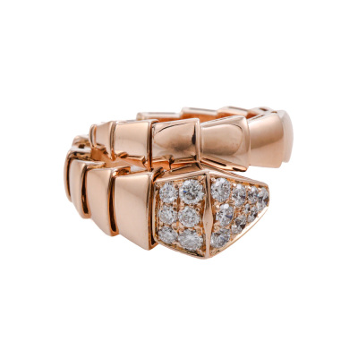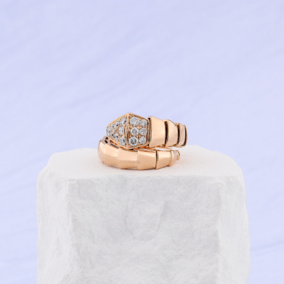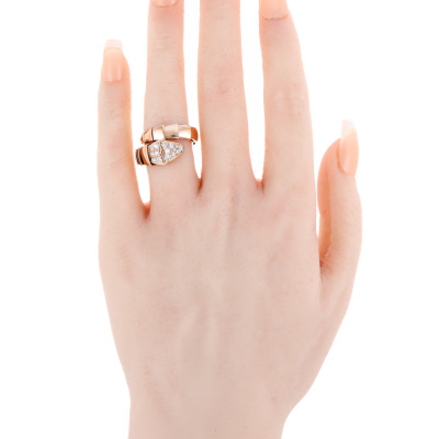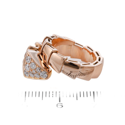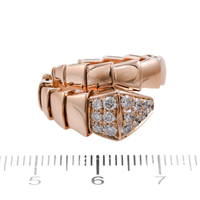 Bvlgari Serpenti Viper ring with 15 round Natural Diamonds totalling 0.53ct (Estimated grading: F VS). 18ct rose gold. Bvlgari stamped size: M (Medium), measures as smallest Australian size: J - ring resizing is not recommended. Note - the wrap around design allows for a slightly bigger fit. Made in Italy. Weight: 11.1g. With Certificate #1203415497692306. (Pre-owned)