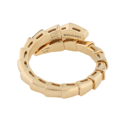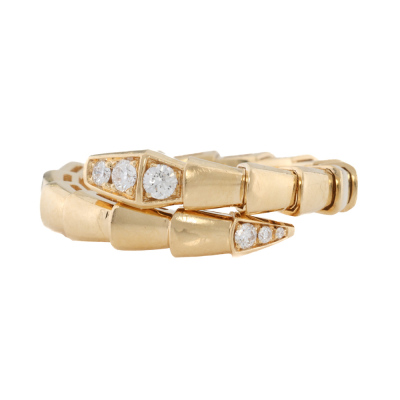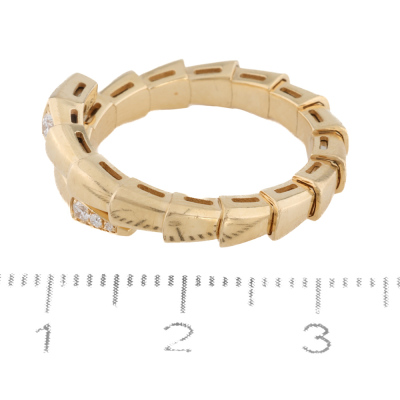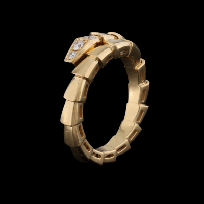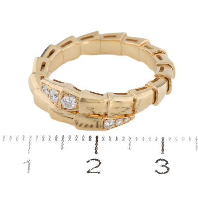 Bvlgari Serpenti Viper Diamond ring with 6 round Natural Diamonds totalling 0.14ct. 18ct yellow gold. Stamped size 54-56, equivalent to ring size M 1/2, - ring resizing is not recommended. Made in Italy. Weight: 6.8g. With Bvlgari box, Bvlgari Authenticity Certificate dated 27/02/2025 and Bvlgari Receipt dated 27/02/2025.