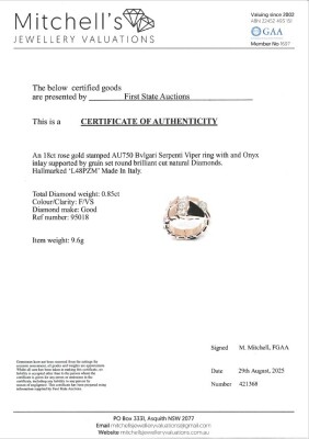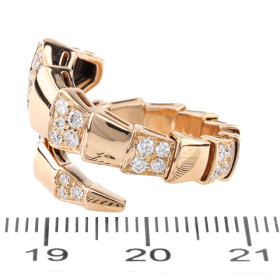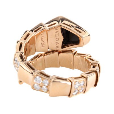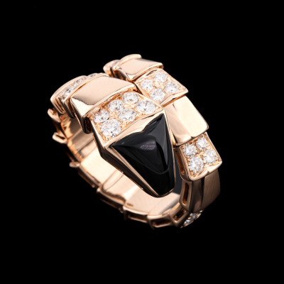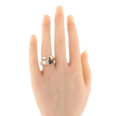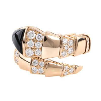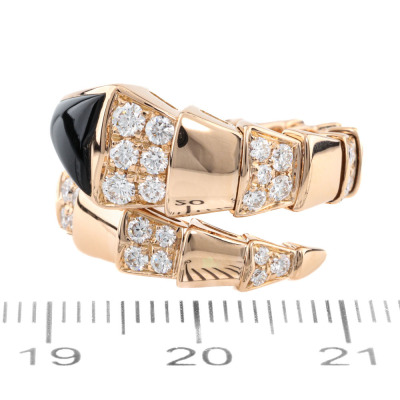 Bvlgari Serpenti Viper ring with Onyx and round Diamonds totalling 0.85ct (Estimated grading: F VS) 18ct rose gold. Made in Italy. Bvlgari stamped size M (Medium), measures as smallest Australian size: K - ring resizing is not recommended. Note - the wrap around design allows for a slightly bigger fit. Band width: 4mm - 8.8mm. Weight: 9.6g. With Certificate #421368. (Pre-owned)