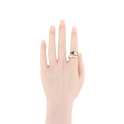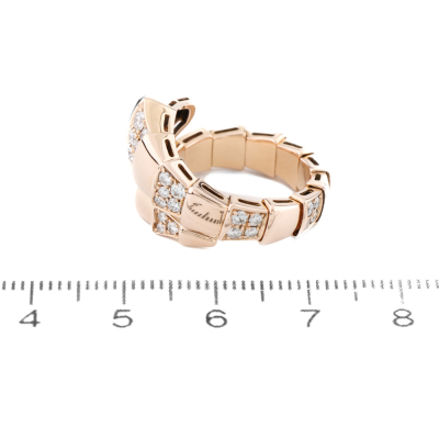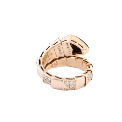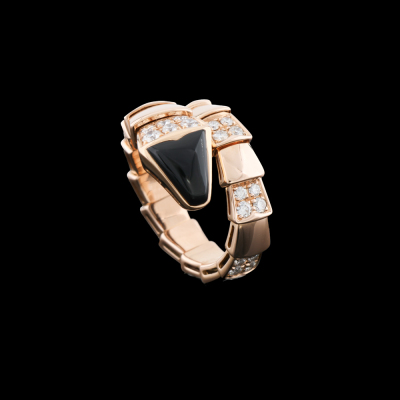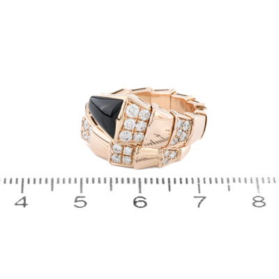 Bvlgari Serpenti Viper ring with Onyx and round Diamonds totalling 0.85ct (Estimated grading: F VS) 18ct rose gold. Made in Italy. Bvlgari stamped size M (Medium), measures as smallest Australian size: K - ring resizing is not recommended. Note - the wrap around design allows for a slightly bigger fit. Band width: 4mm - 8.8mm. Weight: 9.9g. With Bvlgari box & papers dated: 12/12/2016. (Pre-owned)