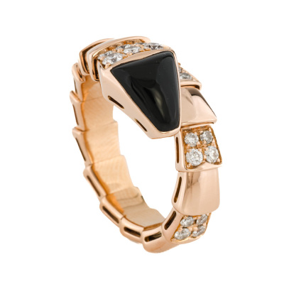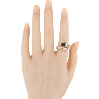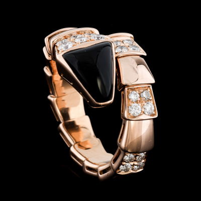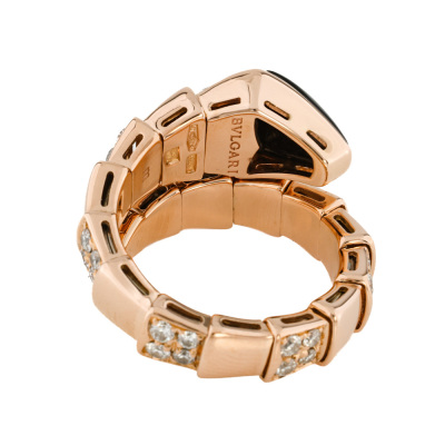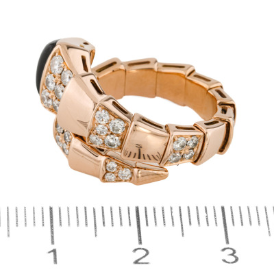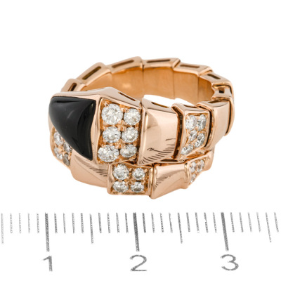 Bvlgari Serpenti Viper ring with Onyx and round Diamonds totalling approximately 0.85ct (Estimated grading: F VS) 18ct rose gold. Made in Italy. Bvlgari stamped size M, measures as smallest Australian size: K - ring resizing is not recommended. Note - the wrap around design allows for a slightly bigger fit. Band width: 4mm - 8.8mm. Weight: 9.7g. With Certificate #8667797674123479