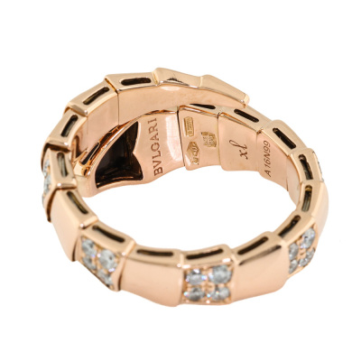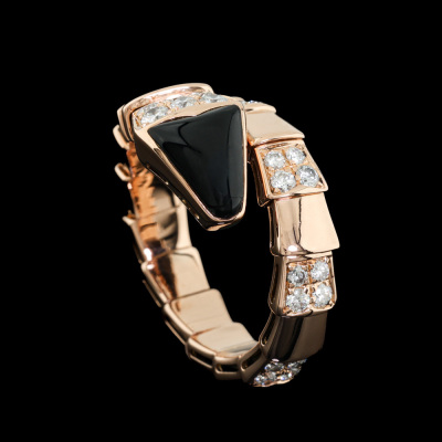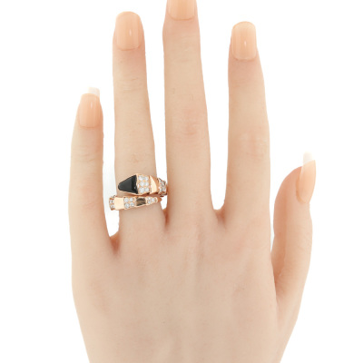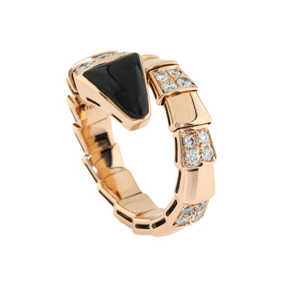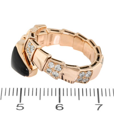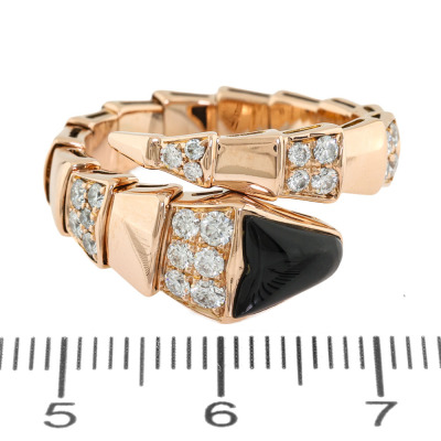 Bvlgari Serpenti Viper ring with Onyx and round Diamonds totalling approximately 0.85ct (Estimated grading: F VS) 18ct rose gold. Made in Italy. Bvlgari stamped size XL. Note - the wrap around design allows for a slightly bigger fit. Band width: 4mm - 8.8mm With certificate #2710835675077445