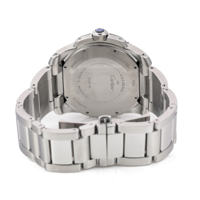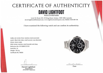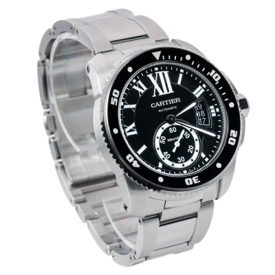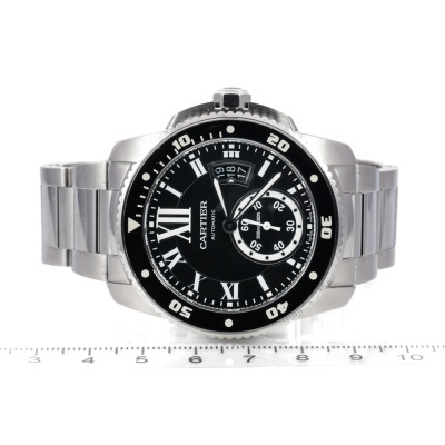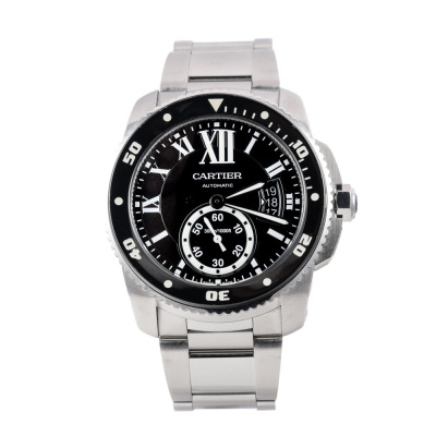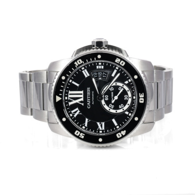 Calibre de Cartier Diver stainless steel automatic mens watch. Black dial, date, small second, case diameter: 42mm, wrist size: 19.5cm, Swiss made. Ref# W7100057/3729. With Cartier stainless steel bracelet and clasp. With Certificate of Authenticity and Cartier box. 3 month FSA warranty. (Pre-owned)