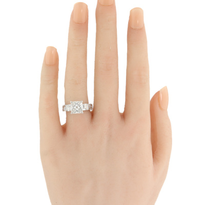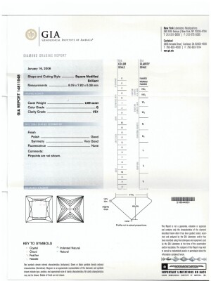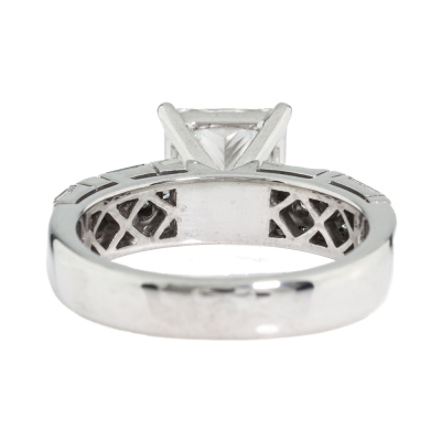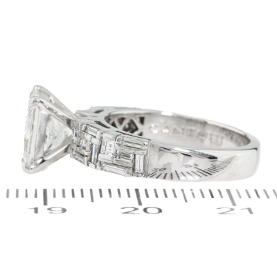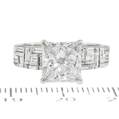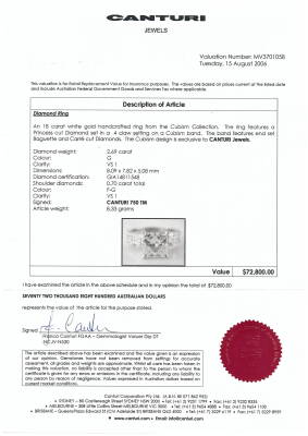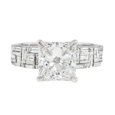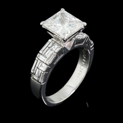 Canturi Cubism Diamond Engagement ring with a centre princess cut Natural Diamond of 2.69ct (with GIA Report graded as G VS1 #14811548) and shoulder baguette & carre cut Natural Diamonds totalling 0.70ct (Estimated grading: F-G VS1). 18ct white gold. Ring size L3/4 - ring resizing is not recommended. Band width: 3.5mm - 4.2mm. Weight: 8.2g. With Canturi Valuation dated 15/08/2006. (Pre-owned)