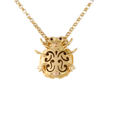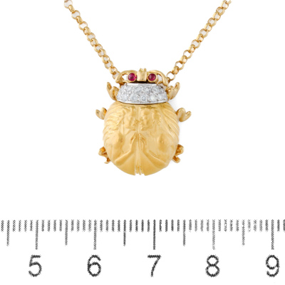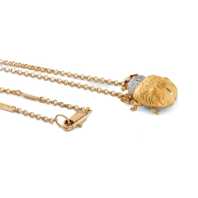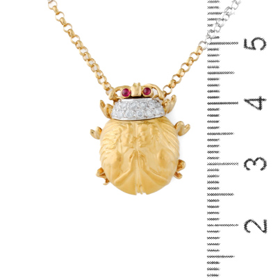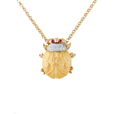 Carrera Y Carrera Egyptian Scarab beetle design pendant with round Natural Diamonds totalling approximately 0.13ct and 2 round cabochon cut Ruby totalling approximately 0.03ct. 22ct yellow and white gold with Carrera Y Carrera 18ct yellow gold attached chain. Length: 47cm. Weight: 10.3g. (Pre-owned)