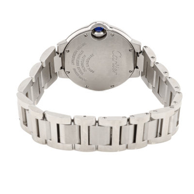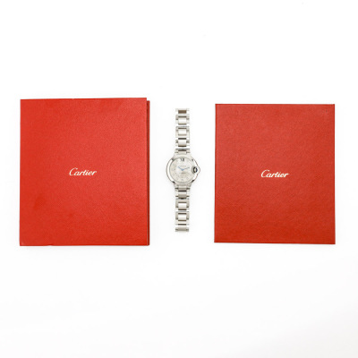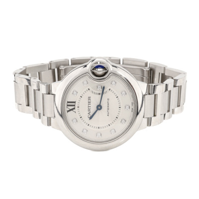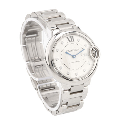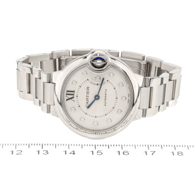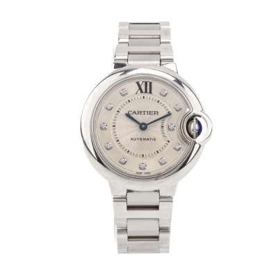 Cartier Ballon Bleu stainless steel automatic ladies watch. Silver dial, Diamond indicators, case diameter: 33mm, wrist size: 17.5cm, Swiss made. Ref# WE902074/3489. With Cartier stainless steel bracelet and clasp. With Certificate of Authenticity, Cartier Guarantee Certificate dated 24/07/2016 and Cartier box. 3 month FSA warranty. (Pre-owned)