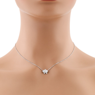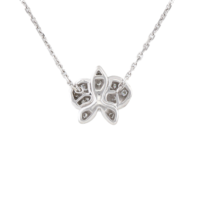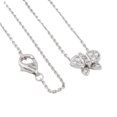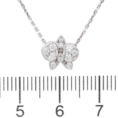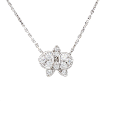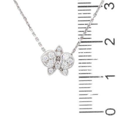 Cartier Caresse dOrchidees Par Diamond necklace with round Natural Diamonds totalling approximately 0.15ct. Motif width: 9.5mm. 18ct white gold with adjustable Cartier 18ct white gold chain. Length: 38cm-41cm. Weight: 2.9g. With Cartier box.