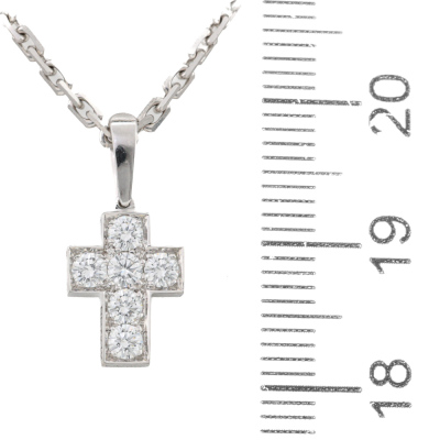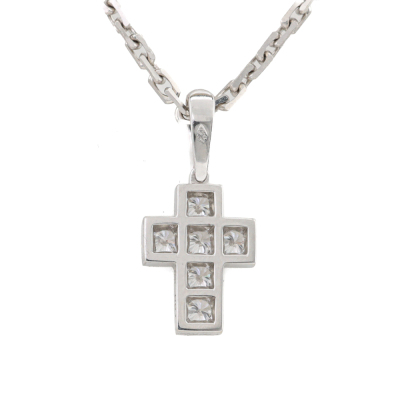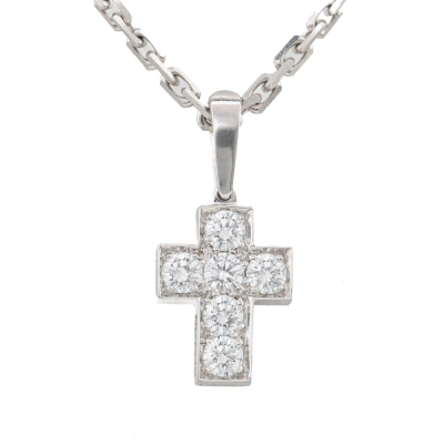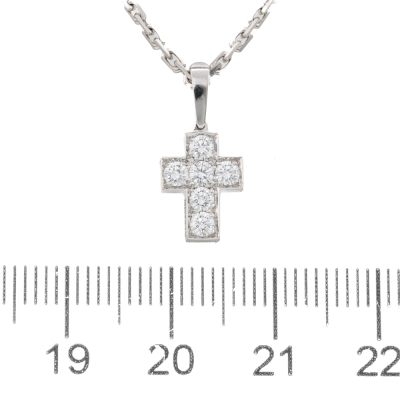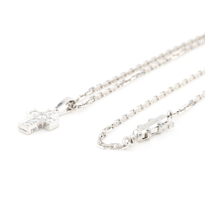 Cartier Cross pendant with 6 round Natural Diamonds totalling 0.42ct (Estimated grading: F-G VS). 18ct white gold with 42cm Cartier 18ct white gold chain. Pendant size: 1.2cm x 0.8cm and 7mm bail. Weight: 6.6g. With Cartier box. (Pre-owned)