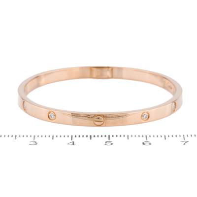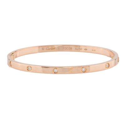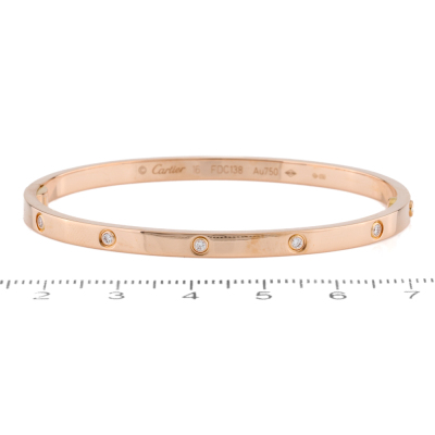 Cartier Love Bangle, small model with 10 round brilliant cut Natural Diamonds totalling 0.21ct. 18ct rose gold. Stamped size: 16. Width: 3.65mm. Weight: 17.1g. With Cartier screwdriver. With Cartier Certificate dated 17/03/2018. (Pre-owned)