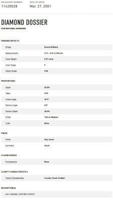 Cartier Diamond solitaire ring with round brilliant cut natural Diamond of 0.27ct (with GIA report graded as F VS2, #11420028). 18ct white gold. Cartier stamped size 52, L. Weight: 5.8g. With Cartier Certificate dated 09/09/2001 and Cartier box. (Pre-owned)
