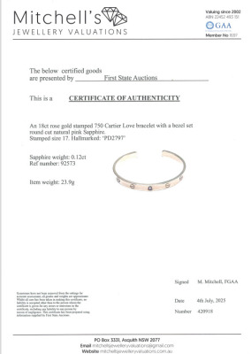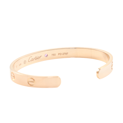 Cartier Love Bracelet with 1 Pink Natural Sapphire. 18ct rose gold. Open bracelet with Cartier stamped size 17. Inner circumference: 15.2cm. Width 6.1mm. Weight: 23.9g. With Cartier pouch. With Cartier polishing receipt dated: 25/08/2025. With Certificate #420918. (Pre-owned)