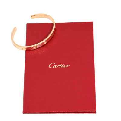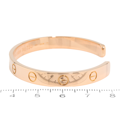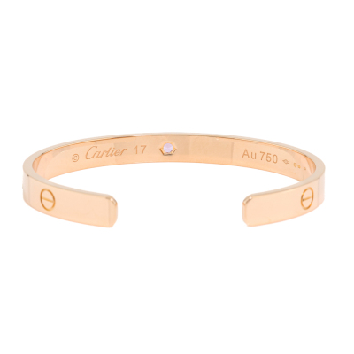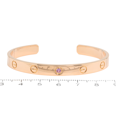 Cartier Love Bracelet with 1 round Natural Pink Sapphire of approximately 0.09ct. 18ct rose gold. Open bracelet with Cartier stamped size 17. measured inner circumference: 15.2cm. Opening: 2.4cm. Width 6.1mm. Weight: 25.4g. With Cartier Box & Cartier Certificate dated: 3/10/2017. (Pre-owned)