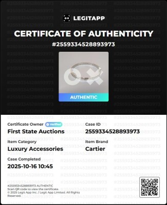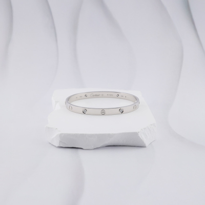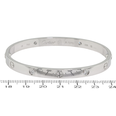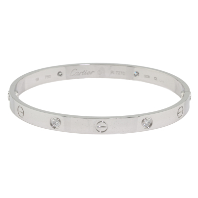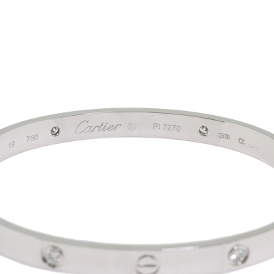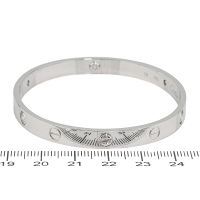 Cartier Love bracelet, classic model with 4 round Natural brilliant cut Diamonds totalling 0.42ct (Estimated grading: F VS). 18ct white gold. Cartier stamped size 19. Width: 6mm. Weight: 35.2g. With unbranded screwdriver. With Certificate #2559334528893973. (Pre-owned)