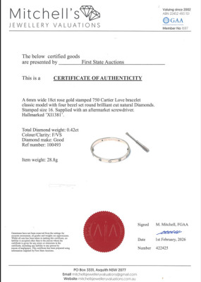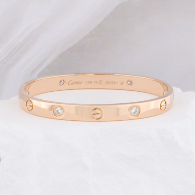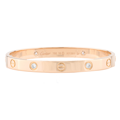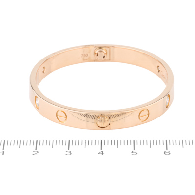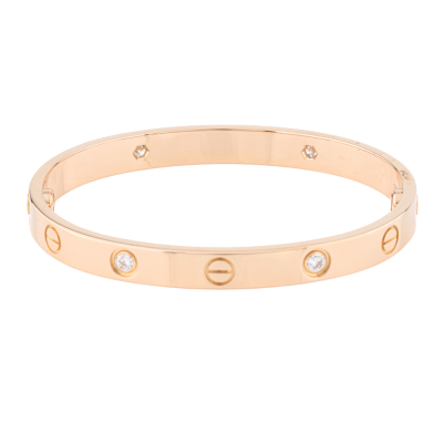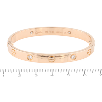 Cartier Love bracelet, classic model with 4 round Natural Diamonds totalling 0.42ct (Estimated grading: F VS). 18ct rose gold. Cartier stamped size 16cm. Width: 6.1mm. Weight: 28.8g. With aftermarket screwdriver. With Certificate #422425.