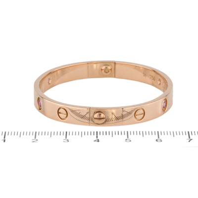 Cartier Love Bracelet with 4 Natural Pink Sapphire totalling approximately 0.40ct. 18ct rose gold. Cartier stamped size 16. Width 6.2mm With aftermarket screwdriver. With Certificate #4244979116893581.