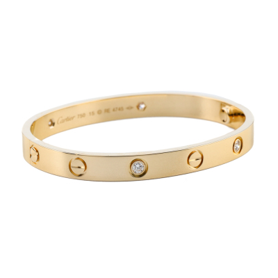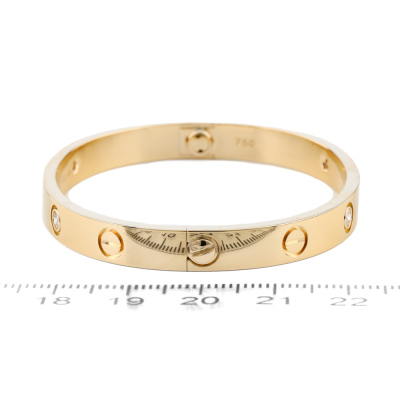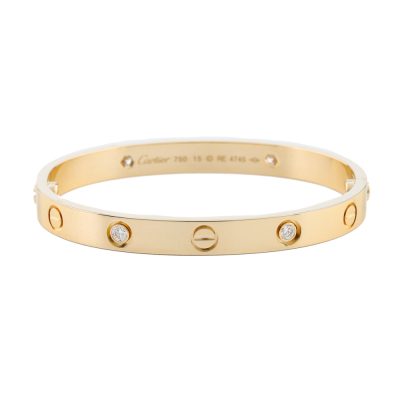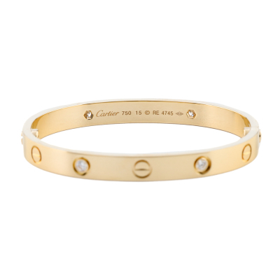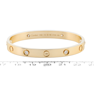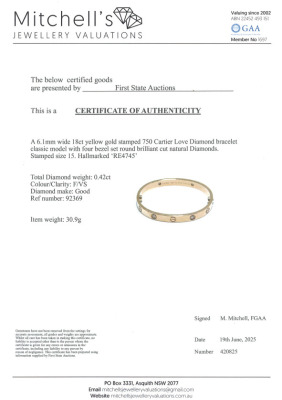 Cartier Love bracelet, classic model with 4 round Natural brilliant cut Diamonds totalling 0.42ct (Estimated grading: F VS). 18ct yellow gold. Cartier stamped size 15. Width: 6.1mm. No screwdriver provided. Weight: 30.9g. With Certificate # 420825. (Pre-owned)