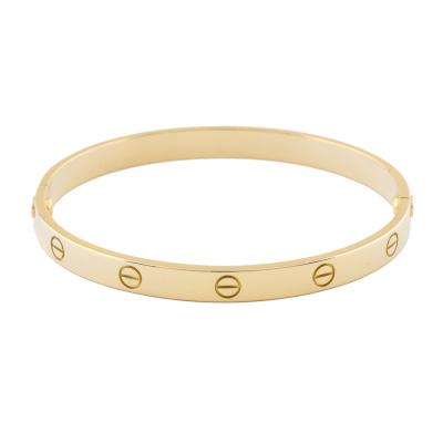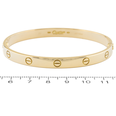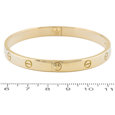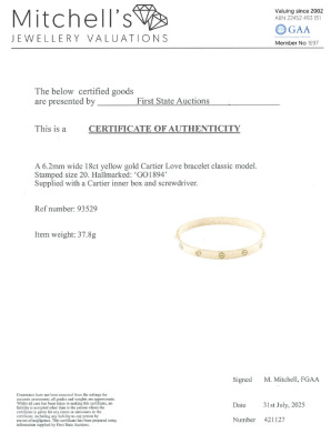 Cartier Love bracelet. 18ct yellow gold. Cartier size 20. Width: 6.2mm. With screwdriver. Weight: 37.8g. With Cartier inner box. With Certificate #421127. (Pre-owned)