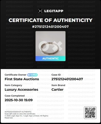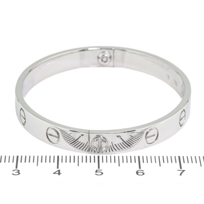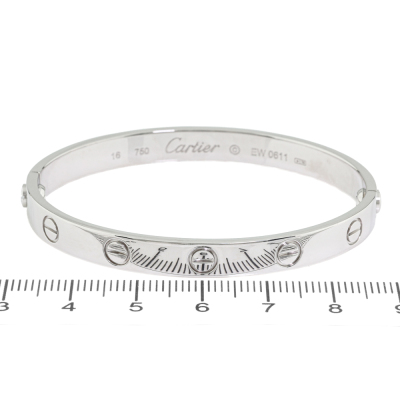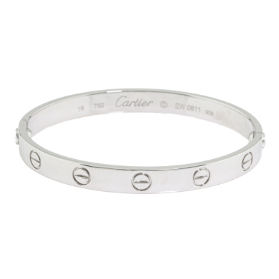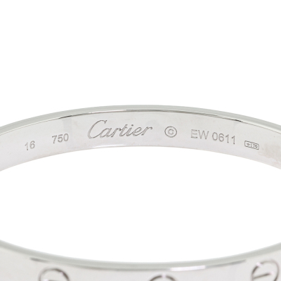 Cartier love bracelet. 18ct white gold. Cartier stamped size 16. Width: 6.2mm. Weight: 29.0g. With Cartier screwdriver. With Certificate #2751212401200407. (Pre-owned)