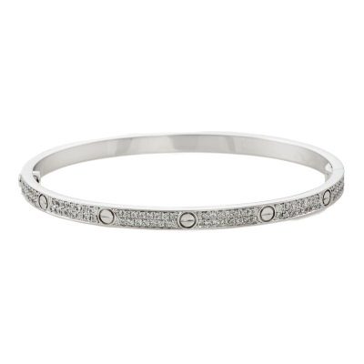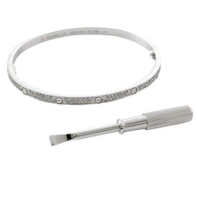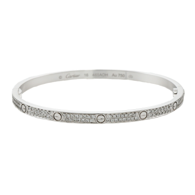Cartier Love bracelet, small model with 177 pave set round Natural Diamonds totalling 0.95ct (Estimated grading: F-G VS-SI). 18ct white gold. Cartier stamped size 16. Width: 3.6mm. Weight: 16.6g. With Cartier screwdriver, Cartier box and Cartier Certificate dated: 20/07/2024.