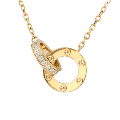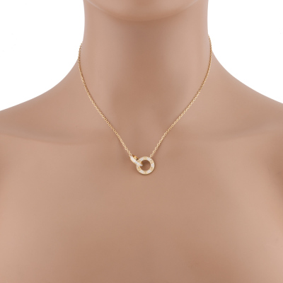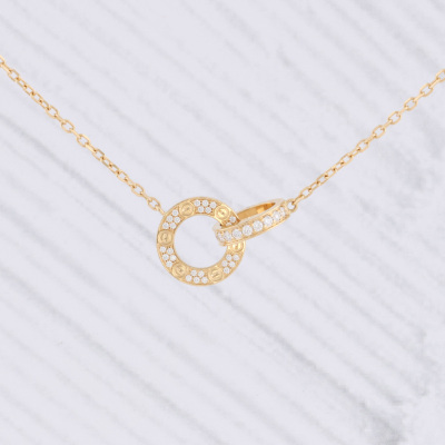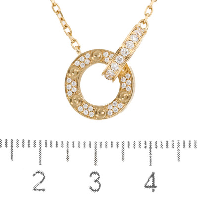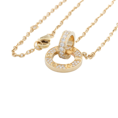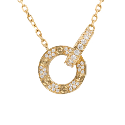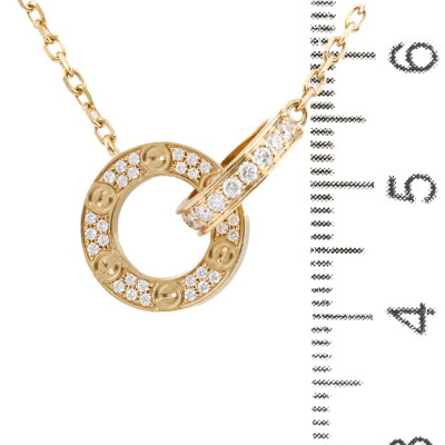 Cartier Love Diamond Oval Pave necklace with 48 round Diamonds totalling 0.30cts (Estimated grading: F VS). Motif length: 19mm. Motif width: 2.6mm. 18ct yellow gold with cartier 38cm - 41cm 18ct yellow gold attached chain. Weight: 6.0g. With Cartier Authenticity Certificate dated 10/05/2025, Cartier Invoice & Cartier box. (Pre-owned)
