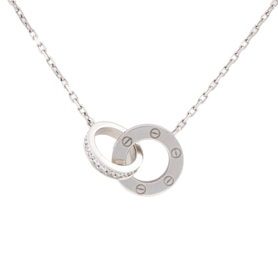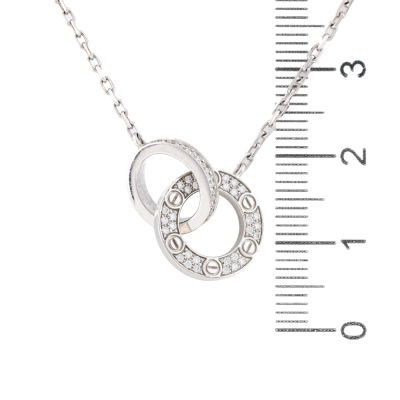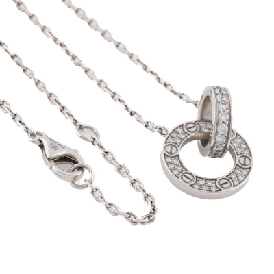 Cartier Love pendant with 48 paved round Diamonds totalling 0.30ct (Estimated grading: F VS). Motif length: 19mm. Motif width: 2.6mm. 18ct white gold with Cartier 18ct white gold attached chain. Length: 38cm - 41cm. Weight: 6.2g. With Cartier Authenticity Certificate dated 17/08/2017 & Cartier box.