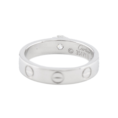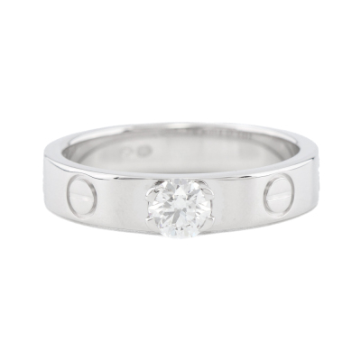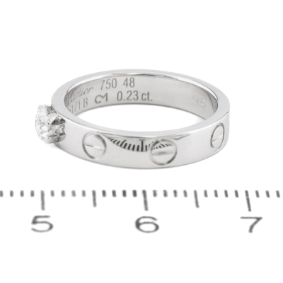 Cartier Mini Love Ring with a round Natural Diamond of 0.23ct (with copy of GIA report graded as E VVS2 #14410507). 18ct white gold. Cartier stamped size 48. Ring size: I - resizing is not recommended. Width: 3.6mm. Weight: 4.1g. With Cartier Certificate of Authenticity dated 19/02/2010 and Cartier box. (Pre-owned)