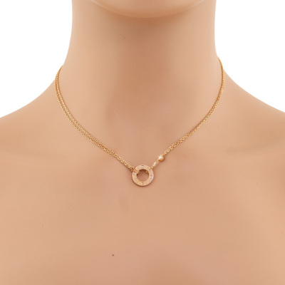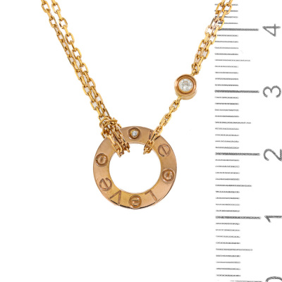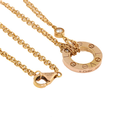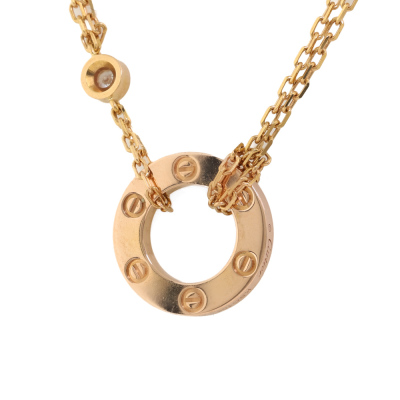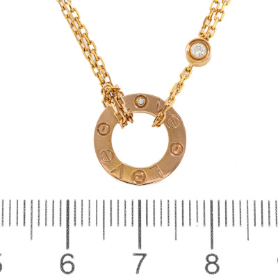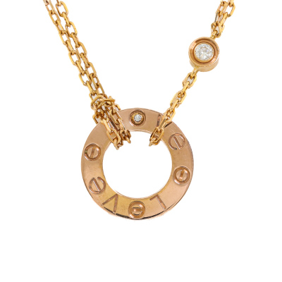 Cartier Love Pendant with 2 round Natural Diamonds totalling 0.03ct. 18ct rose gold with 18ct rose gold attached Cartier double chain. Adjustable length: 38cm - 41cm. Outer diameter: 13mm. Weight: 6.0g.