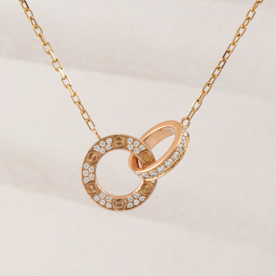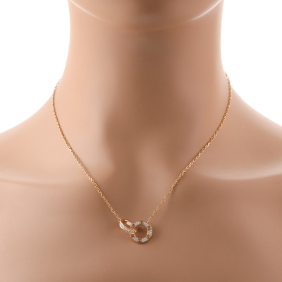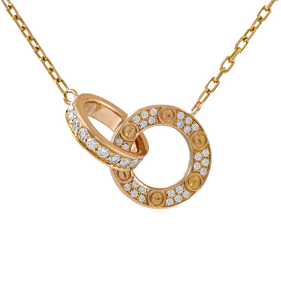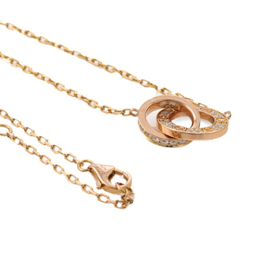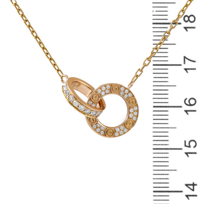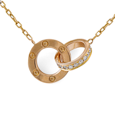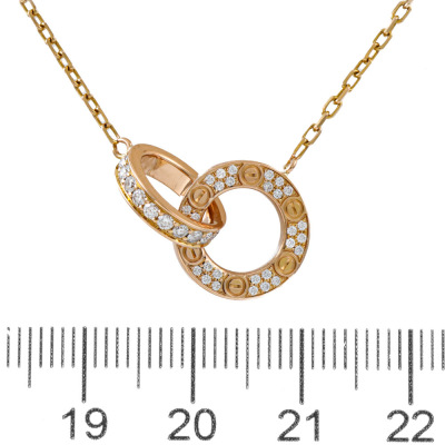 Cartier Love pendant with paved round Diamonds totalling 0.48ct (Estimated grading: F VS). Motif length: 19mm. Motif width: 2.6mm. 18ct rose gold with Cartier 18ct rose gold attached chain. Length: 41cm - 45cm. Weight: 5.8g. With Cartier Authenticity Certificate dated 25/03/2018 and Cartier box.