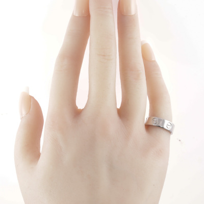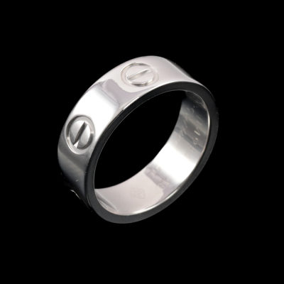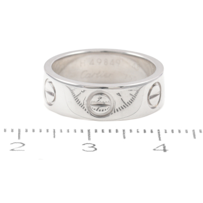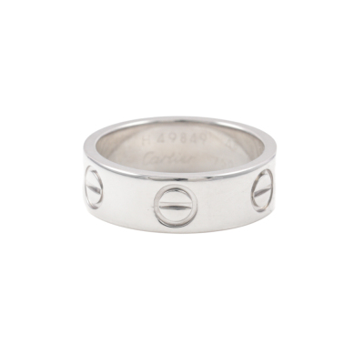 Cartier Love ring, classic model. 18ct white gold. Cartier stamped size 48, actual ring size H1/2 - ring resizing is not is not recommended. Band width: 5.5mm. Weight: 6.2g. (Pre-owned)