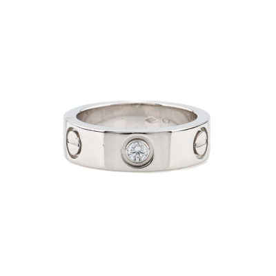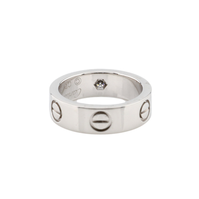 Cartier Love ring, classic model with 1 round Natural Diamond of approximately 0.07ct. Platinum - 950. Cartier stamped size 50, measures as Australian size: J 1/2. Band width: 5.5mm. Weight: 11.3g. (Pre-owned)