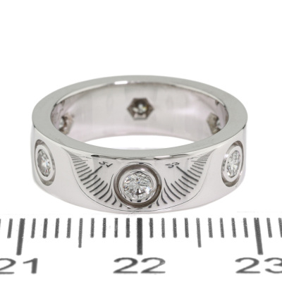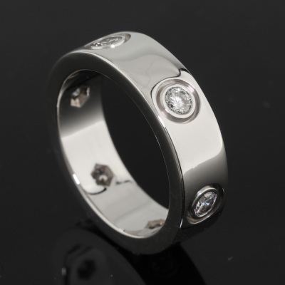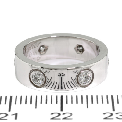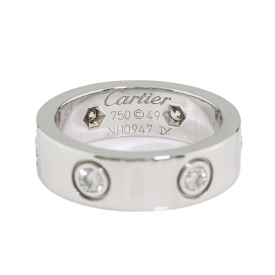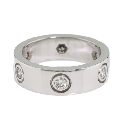 Cartier Love ring, classic model with 6 round Natural Diamonds totalling approximately 0.46ct. 18ct white gold. Cartier stamped size 49, measures as Australian size: I 1/2. Band width: 5.6mm. Weight: 8.1g. With Cartier inner box. (Pre-owned)