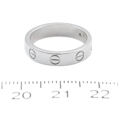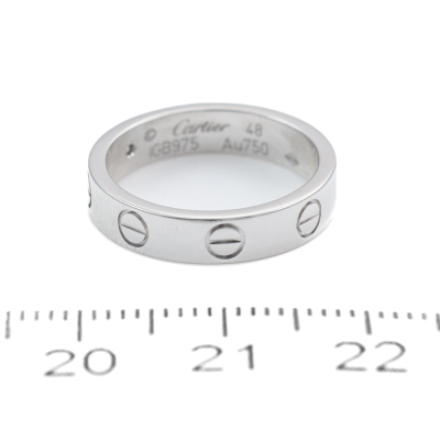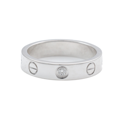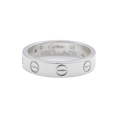 Cartier Mini Love Ring with a round Natural Diamond of 0.02ct. 18ct white gold. Cartier stamped size 48. Ring size: H3/4 - resizing is not recommended. Width: 3.8mm. Weight: 4.4g. With Cartier Certificate dated 19/12/2019 and Cartier box. (Pre-owned)